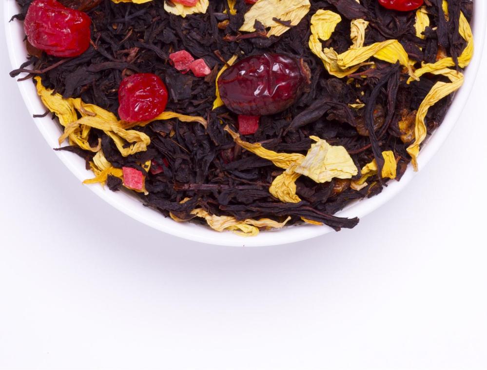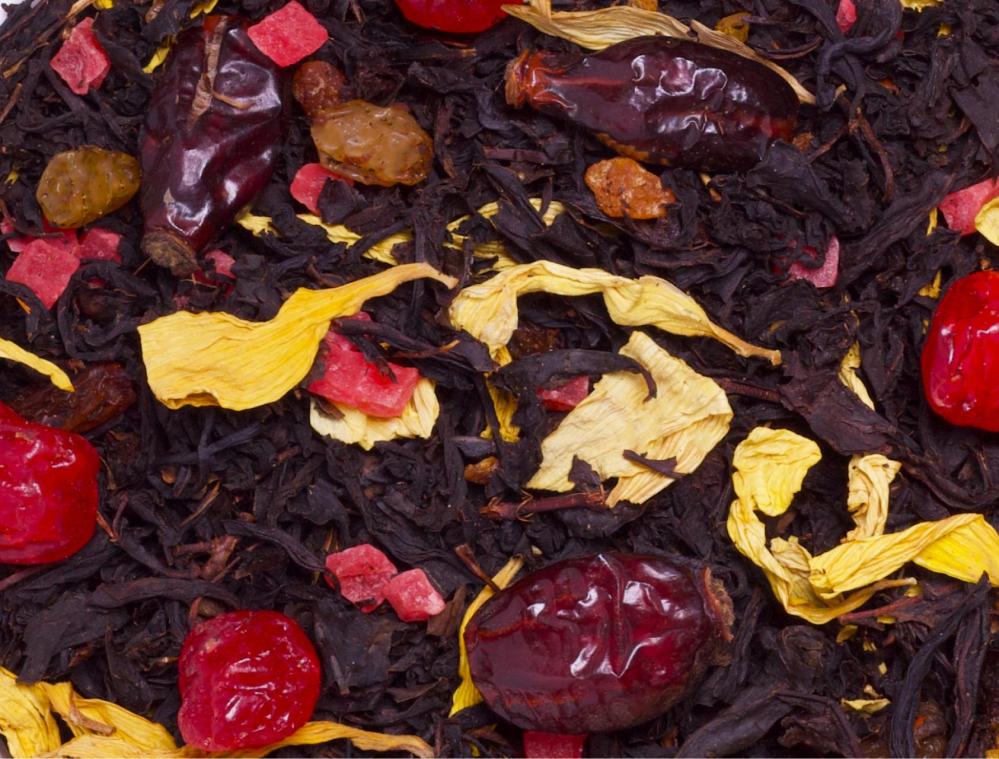 Состав: чёрный чай, шиповник, вишня красная, изюм, ананас, лепестки подсолнуха.