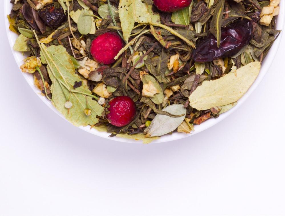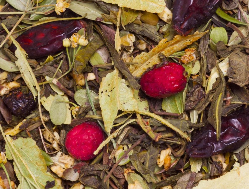 Состав: чай зелёный, шиповник, клюква, липа, ромашка, толокнянки листья, яблоки