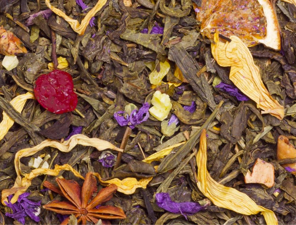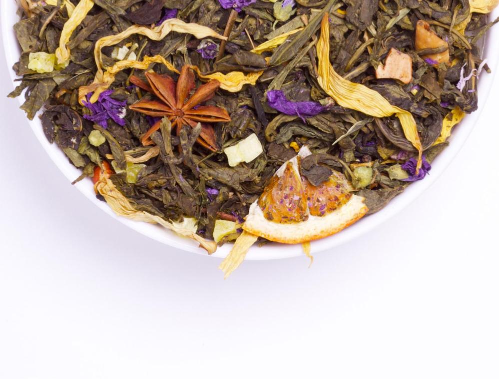 Состав: чай зелёный, бадьян, лепестки подсолнуха, мальва, вишня красная, апельсин сушёный, яблоко
