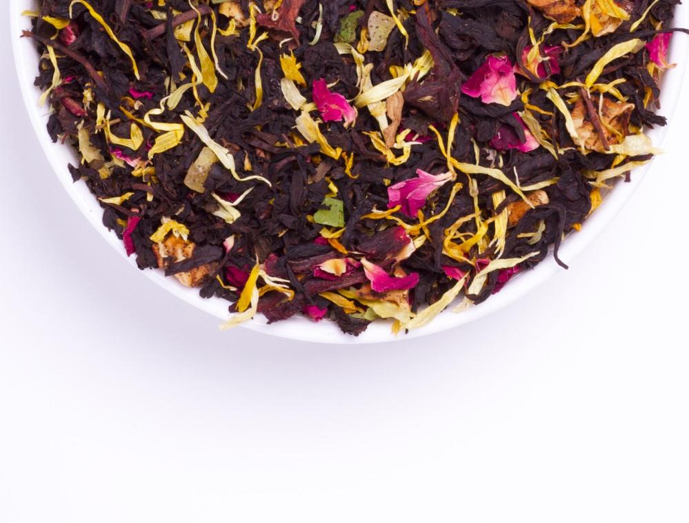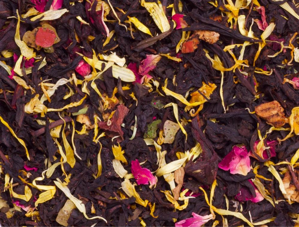 Состав: чай чёрный, гибискус, роза лепестки, календула, цукаты ананаса, яблоко, курага, изюм.