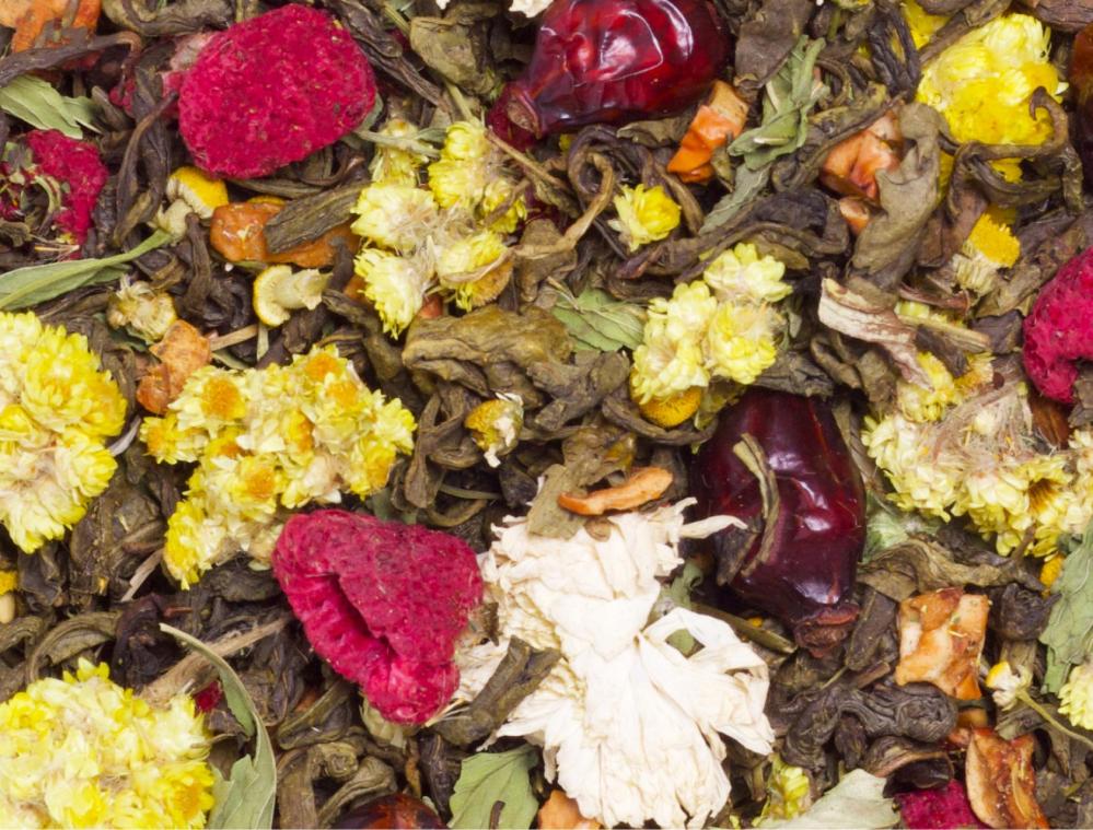 Состав: чай зелёный, боярышник, яблоко сушёное, шиповник, мята, бессмертник, ягоды клубники.