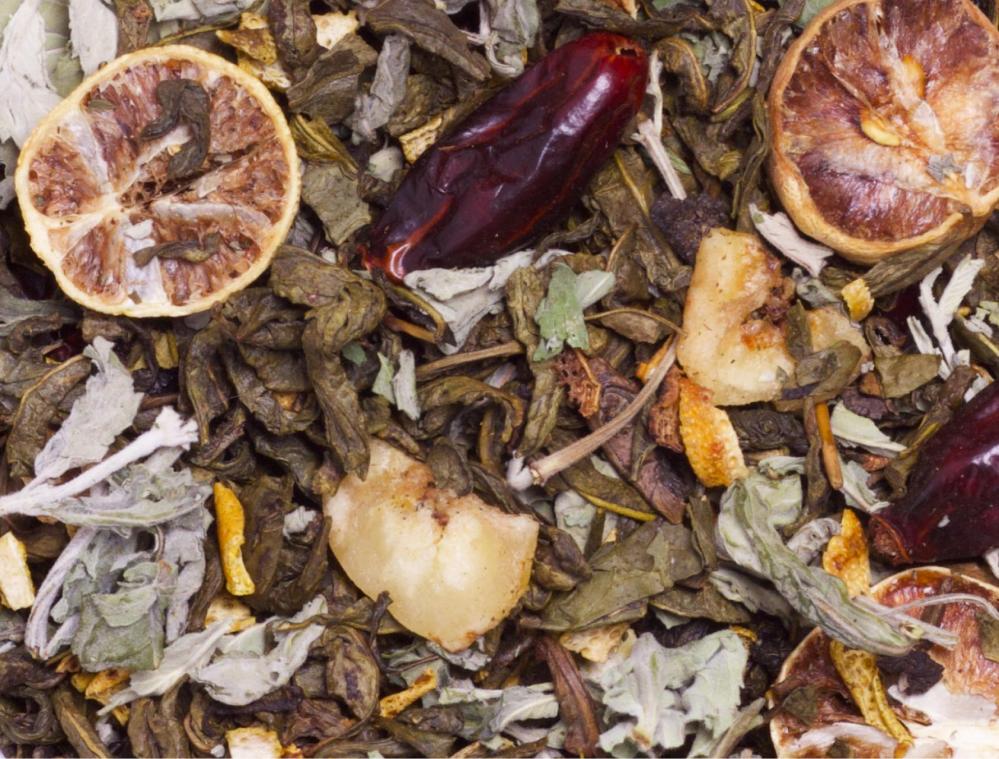 Состав: чай зелёный, мелисса, банан сушёный, имбирь сушёный, цедра лимона, лимон сушёный, шиповник